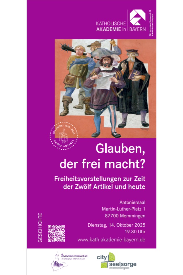 "Zur rechtlichen Bedeutung der Zwölf Artikel" - Vortrag von Dr. David von Mayenburg und die Tagung der Katholischen Akademie in Bayern in Kooperation u.a. mit Bildung Evangelisch "Glauben, der frei macht - Freiheitsvorstellungen zur Zeit der Zwölf Artikel und heute".