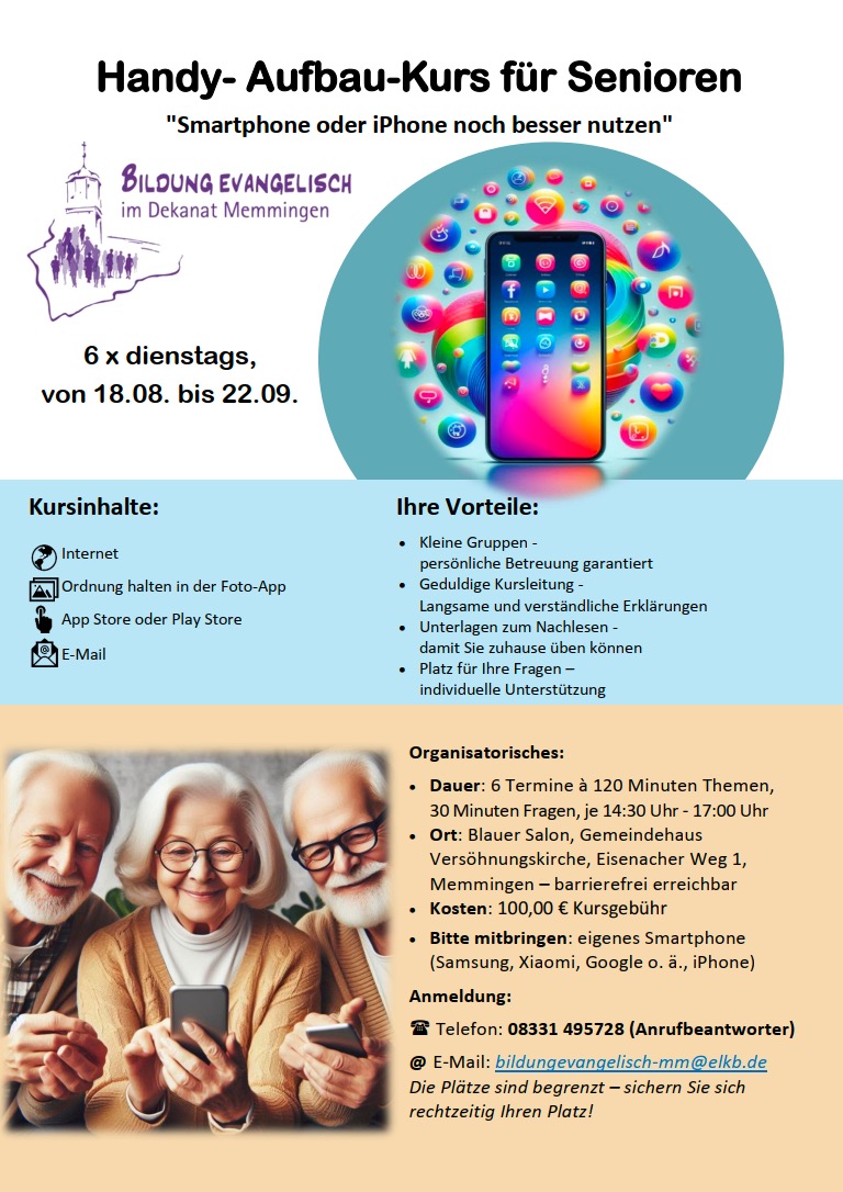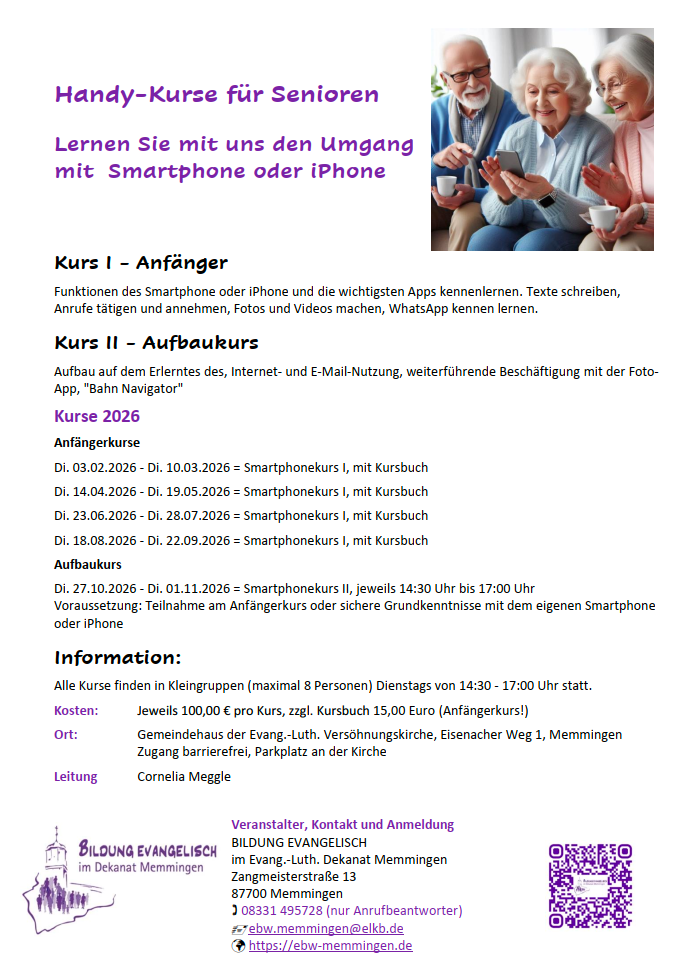 Das Evangelische Bildungswerk bietet sowohl eigene Bildungs-Veranstaltungen an (siehe Newsletter) und informiert über Bildungs-Angebote in den Kirchengemeinden des Evangelisch-Lutherischen Dekanats Memmingen unter dem Menüpunkt "Bildung in den Gemeinden".