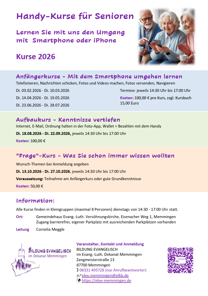 Das Evangelische Bildungswerk bietet sowohl eigene Bildungs-Veranstaltungen an (siehe Newsletter) und informiert über Bildungs-Angebote in den Kirchengemeinden des Evangelisch-Lutherischen Dekanats Memmingen unter dem Menüpunkt "Bildung in den Gemeinden".