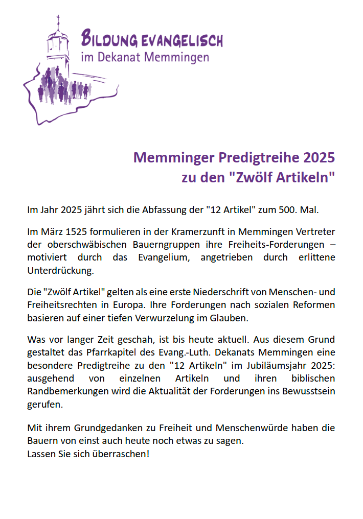 In Zusammenarbeit mit dem Team der Stadt der Freiheitsrechte ist auch BLDUNG EVANGELISCH an den zahlreichen Veranstaltungen zum Gedenkjahr mit einer Predigtreihe zu den 12 Artikeln in verschiedenen Gemeinden des Evang.-Luth. Dekanats Memmingen beteiligt. Den Flyer mit den Terminen finden Sie hier.